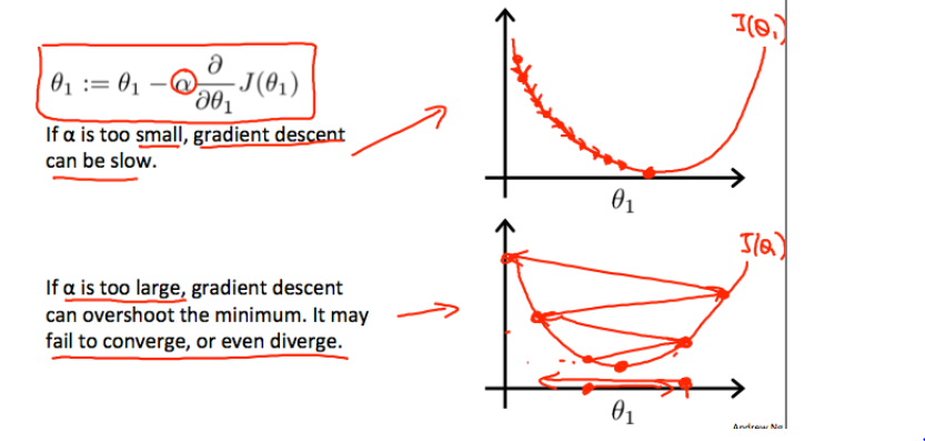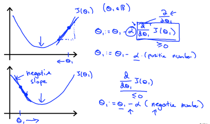 여기서 오른쪽에서 내려올 때 함수 J의 미적분값이 양수이므로 θ1이 learning rate에 따라 크게 또는 작게 감소하여 최적의 값으로 도달하며 반대로 왼쪽에서 내려올 때는 J의 미적분값이 음수이므로 θ1가 점점 커지면서 최적의 값을 찾는 것을 알 수 있다.