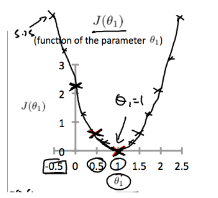 최적의 값은 세타가 1이되면 즉 기울기가 1일 때 J의 값이 0이 되기 때문이다.