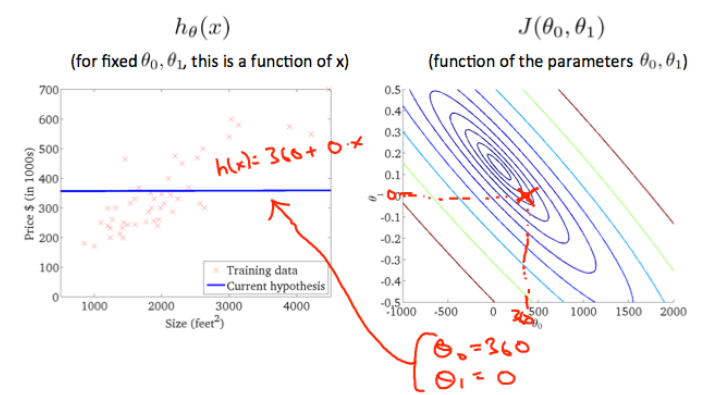 여기보시면 Contour plot의 높이가 cost function을 나타내고 가장 작은 값일 때의 기울기와 절편을 구하는데 도와준다.