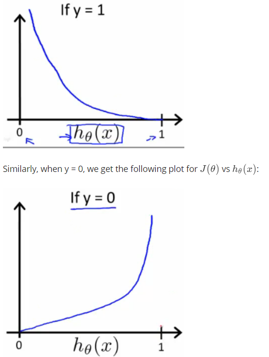 위 그림과 같이 y=0과 y=1일 때 그래프를 그리면 다음과 같습니다. 예측값이 1인데 실제값이 0이고 예측값이 0인데 실제값이 1이면 Cost Function은 무한대로 발산하게 됩니다.