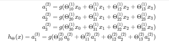 activation 값을 a1, a2, a3를 구하고 난뒤에 h의 함수로 넣어줘 최종적으로 나오는 값을 구한다. 그 과정에서 로지스틱 회귀 g함수에 들어가기전 theta와 x의 곱들을 간단히 식으로 정리하면 위의 z와 같다.
