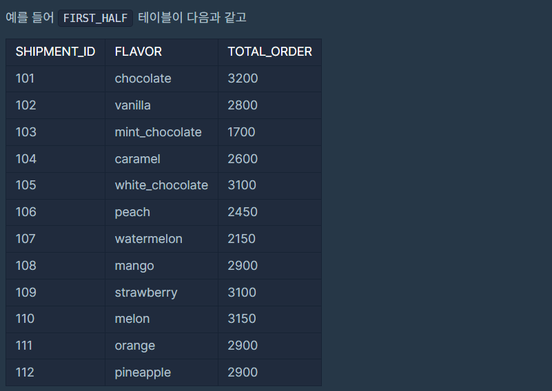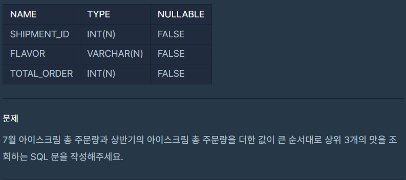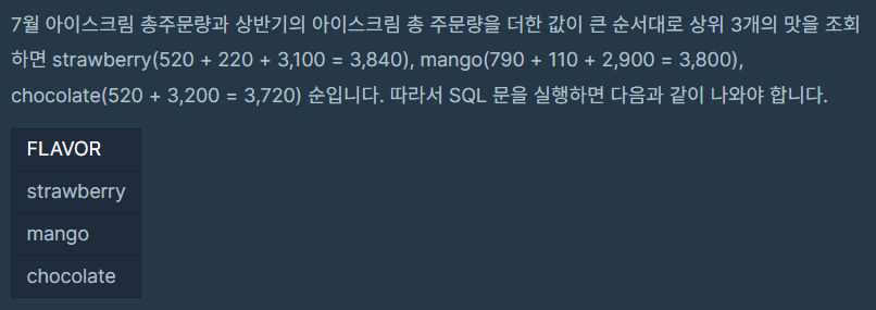 만들어둔 TOTAL변수를 가지고, 상반기 주문량과 WHERE 사용해 테이블 조인하고, ORDER BY에서 총 아이스크림 주문량 합계로 내림차순으로 정렬해 가장 큰 값 3개만 뽑았습니다.