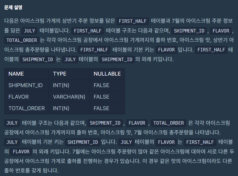 JOIN을 사용하면 JULY의 FLAVOR값의 중복이 있기 때문에 FIRST_HALF의 TOTAL_ORDER값이 중복되어 더해지는 문제점이 생기기 때문에 서브쿼리를 사용해 쿼리문을 만드는 것이 포인트였습니다.