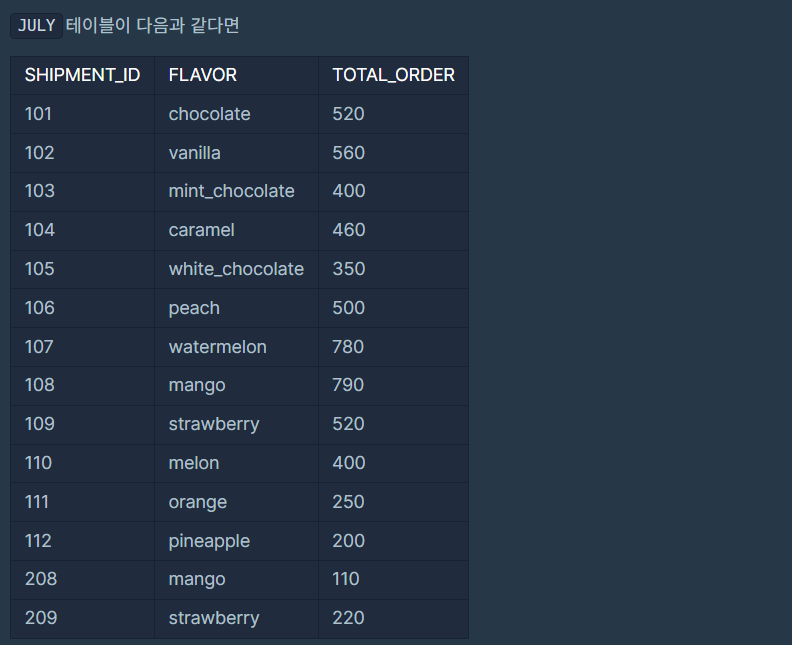 INNER JOIN을 사용하지 않고, 서브쿼리를 사용해 FLAVOR 별 7월 총 주문량을 TOTAL로 만들었습니다.