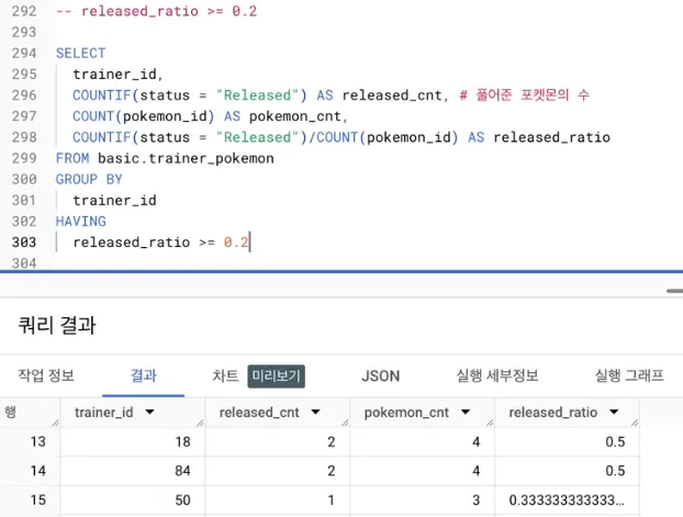 COUNTIF, GROUP BY, HAVING 사용한 SQL 예시